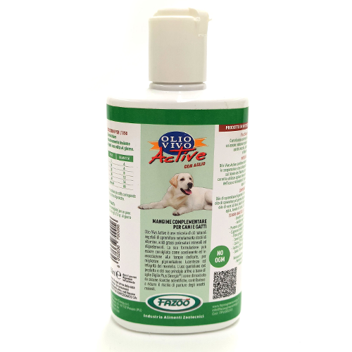 Olio Vivo ACTIVE un prodotto naturale no OGM di alta qualità, ricco di vitamine, minerali, oligoelementi ed acidi grassi polinsaturi, utile per mantenere in salute il vostro cane e gatto.